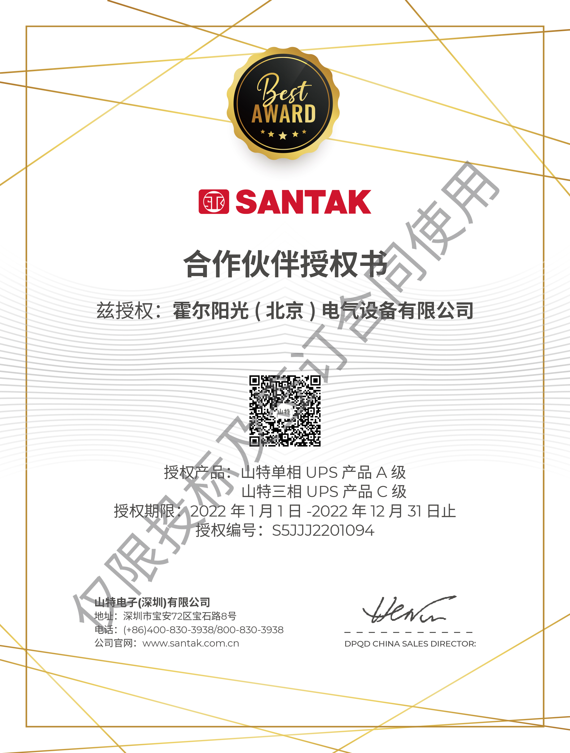 2022年1月,我司(霍爾陽光(北京)電氣設備有限公司)與續簽約成為山特中國區A級合作伙伴。授權證書編號S5JJJ2201094