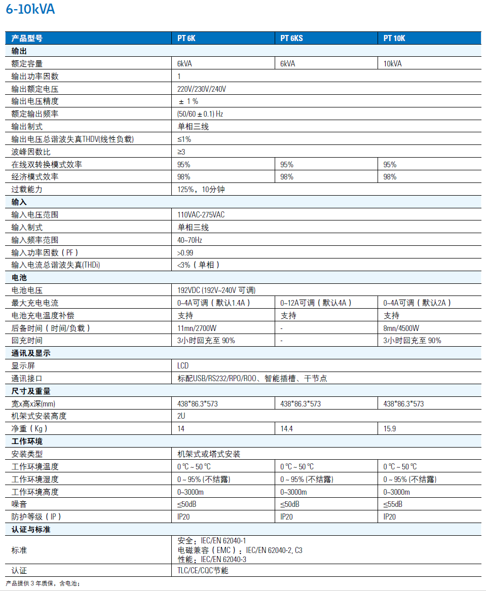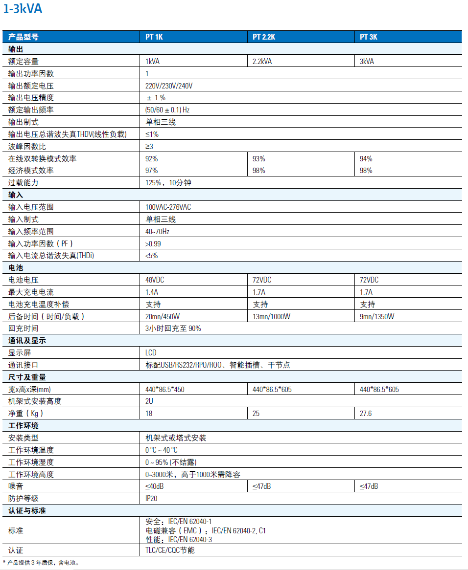 更高的效率,更小的體積。全系列輸出功率因數(shù)為1,10kVA雙轉(zhuǎn)換模式效率高達95%,機架式安裝時高度2U,深度小于600mm。